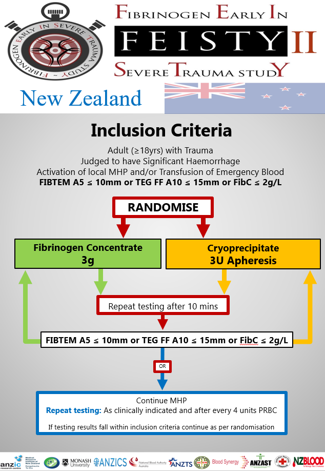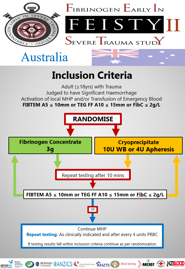 FEISTY II will be coordinated by the Australian and New Zealand Intensive Care Research Centre (ANZIC-RC), is endorsed by the Blood Synergy Investigators, the Australian and New Zealand Intensive Care Society Clinical Trials Group (ANZICS-CTG), the Australian College of Emergency Medicine Clinical Trials Network (ACEM-CTN), the Australian and New Zealand Trauma Society (ANZTS) and Australian and New Zealand Association for the Surgery of Trauma (ANZAST) and will address a key evidence gap in the management of severely injured trauma patients with major haemorrhage.